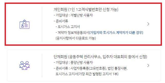 ① 중앙난방 사용으로 입주자대표회의, 관리사무소에서 대표로 신청하시는 것이 아니라면 [개인회원]으로 선택해 줍니다.
